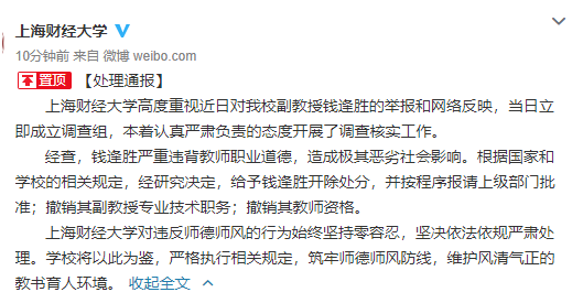 上海财大在布告中写道,上海财经大学分外的注重近来对我校副教授钱逢胜的告发和网络反映,当日当即建立查询组,本着仔细严厉担任的情绪打开了查询核实作业。