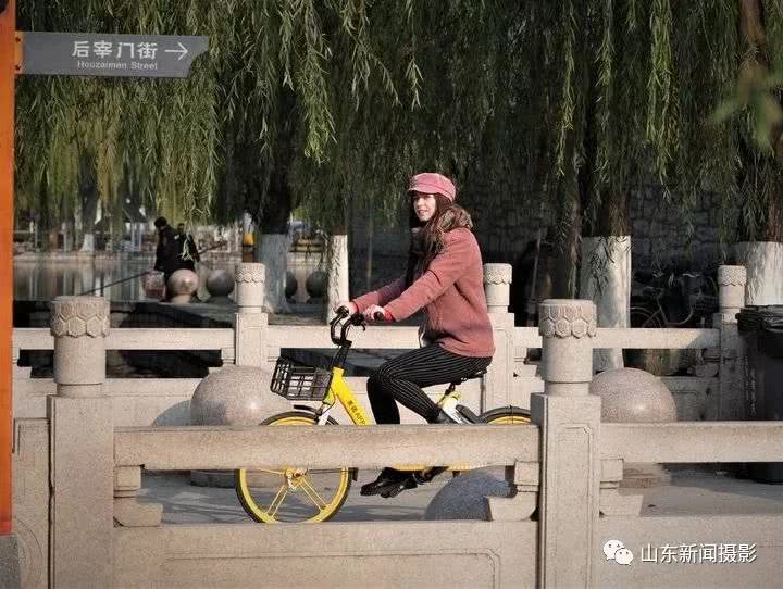 卡丽娜俨然是一名济南人了,她骑同享单车在老城区旅游。