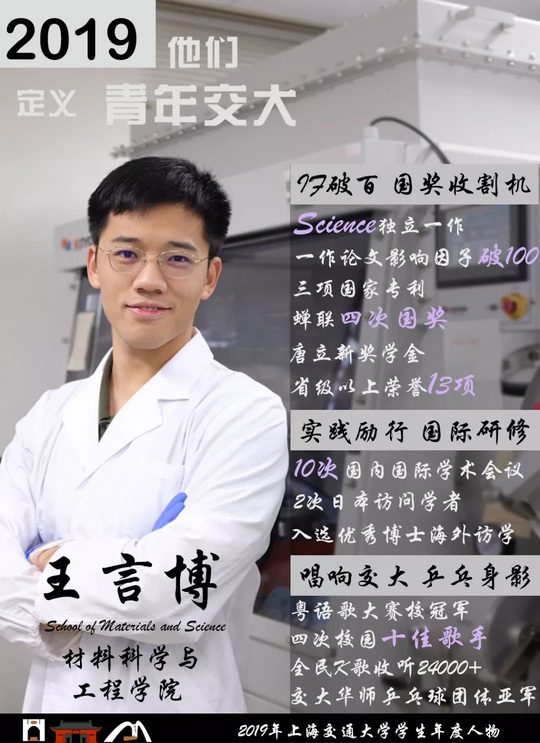 近来,上海交通大学25岁博士研讨生王言博荣获上海交通大学2019“学生年度人物”和第四届上海交通大学研讨生“学术之星”的荣誉。