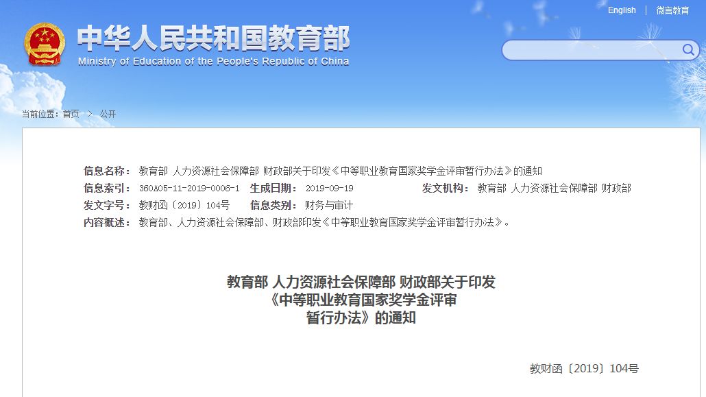 依据《财政部 教育部关于调整职业院校奖助学金方针的告诉》(财教〔2019〕25号)和《教育部 人力资源社会保障部 财政部关于印发〈中等职业教育国家奖学金评定暂行办法〉的告诉》(教财函〔2019〕104号)规则,教育部、人力资源社会保障部、财政部联合成立了中等职业教育国家奖学金评定领导小组,设立了中等职业教育国家奖学金评定委员会,依照客观、公平、公平的准则,对各省(区、市)、各计划单列市、新疆生产建设兵团教育部分和人力资源社会保障部分所属中等职业学校(含技工学校,下同),教育部直属高等学校所属中等职业学校报送的评定资料进行了仔细评定。经评定确认,共19915名学生取得2018—2019学年度中等职业教育国家奖学金,每人奖赏6000元,现予布告。