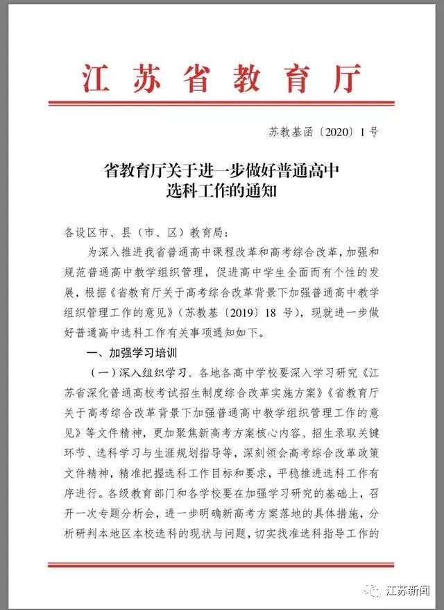 刚刚,江苏省教育厅发布《关于进一步做好普通高中选科作业的告诉》,清晰了高一禁止选科分班,不得根据选科人数多寡约束学生选科,答应学生通过一段时刻学习后从头挑选选考科目。