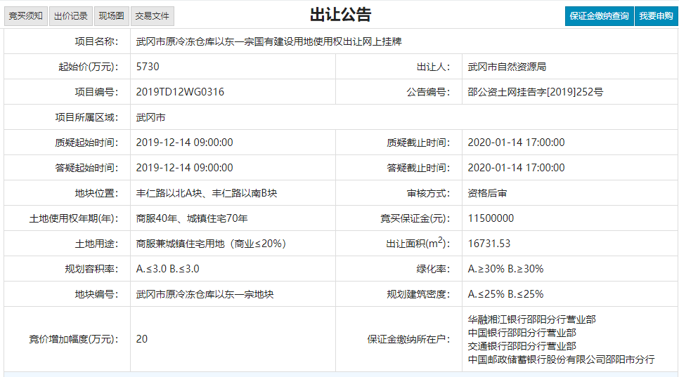 一宗国有建造用地使用权网上挂牌