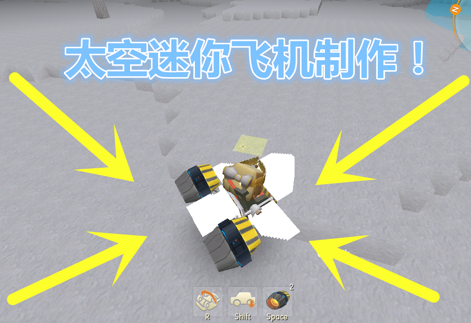 第四步抵达太空后就能够开端拼装迷你飞机了,将道具摆放在地面上,然后在中心装置一个驾驭座椅,最终在后面装置两个飞翔推进器就能够了。