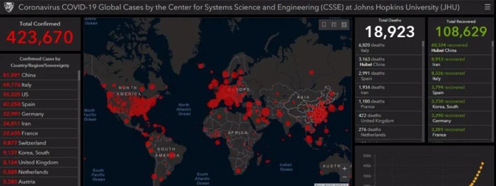 依据约翰斯霍普金斯大学实时计算多个方面数据显现,到北京时间25日16时,全球新冠肺炎确诊病例累计423670例。