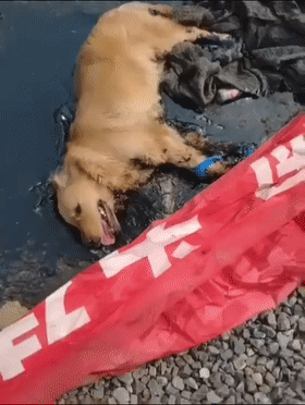 近来,湖北襄阳一处工地上,有工人发现有只流浪狗不小心掉进的沥青池里,就用铲机把它捞出来,放在了一旁的草地上。