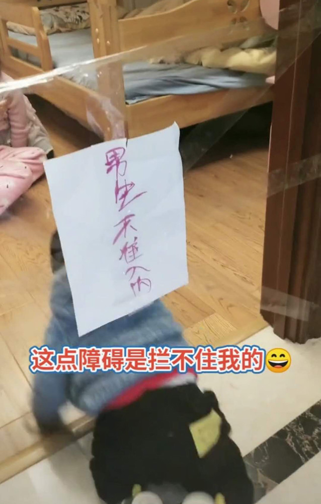 她们不想被刚学会走路的弟弟打扰,就在卧室门口粘贴了“男生禁绝入内”的标语,并在门口多粘贴了一些胶带,便是避免弟弟闯入。不过两个姐姐并没想到这个方法会毫无作用,弟弟走到姐姐门前的时分发现走不曩昔,当即就趴下身子爬了曩昔。弟弟对那标语视若无睹,即便是看见了,弟弟也不认字。不过爸爸就有些无法了,心想:我到底是进仍是不进?网友们见状纷繁笑翻,并宣布了自己的观点。