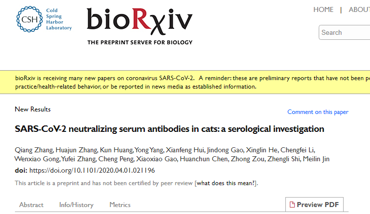 4月3日,华中农业大学金梅林教授、中科院武汉病毒所石正丽教授协作在预印本渠道bioRxiv上宣布题为:SARS-CoV-2 neutralizing serum antibodies in cats: a serological investigation的研讨论文。此项研讨标明,新冠病毒在疫情迸发期间感染了武汉的猫群,在查询样本中,14.7%的猫可以终究靠直接酶联免疫吸附试验(ELISA)检测到新冠病毒的存在。