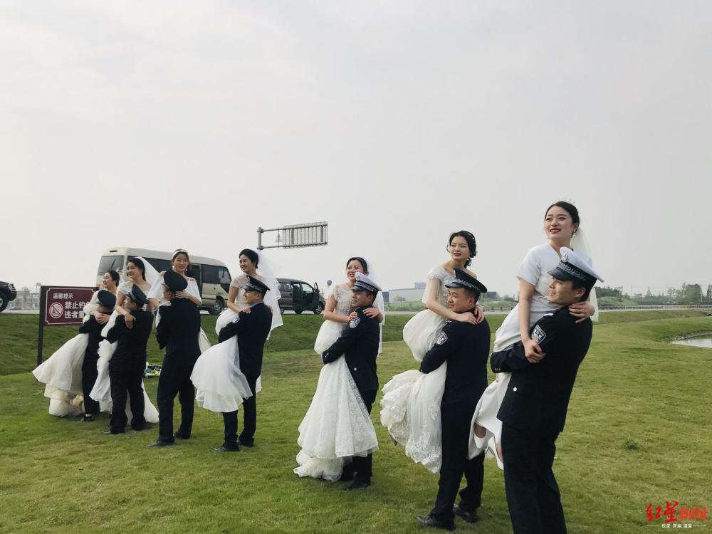 “请新郎把新娘抱起来,笑得高兴一点。”4月7日下午,在四川广汉市宏达立交桥邻近的草坪绿地上,7对民警新人正在拍照婚纱照。今年年初,他们奋战在防疫一线,自动取消了本来定下的婚礼。广汉市公安局使用民警调休时刻,决议会集为7对新人拍照一次婚纱照。得知此事,广汉一家影楼表明乐意免费供给服务,作为对一线民警的感恩与回馈,感谢他们在这次抗击疫情作业中的支付与尽力。